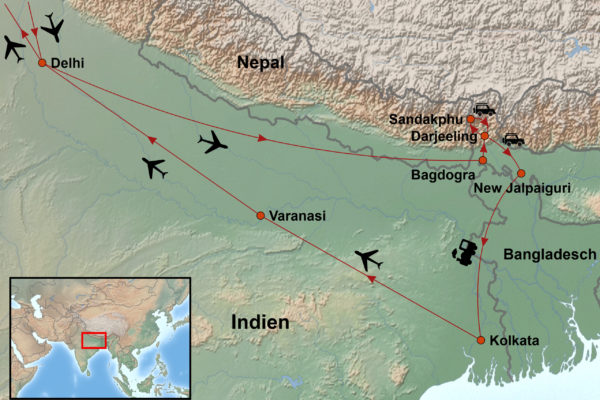 Auf dieser 12-tägigen Reise lernen Sie Indiens Schätze näher kennen. Von smaragdgrünen Teeplantagen über gigantische Berge, facettenreiche Städte bis hin zu kleinen traditionellen Dörfern bietet diese Indien-Reise ein sehr abwechslungsreiches Programm. Begonnen wird in der für ihren Schwarztee bekannten Stadt, Darjeeling. Umgeben von Hügeln und Bergen findet man in Darjeeling viele koloniale Bauten, buddhistische Klöster und noch vieles mehr. Nach einem Ausflug nach Sandakphu im Singalila Nationalpark kehren Sie für eine weitere Nacht zurück nach Darjeeling, bevor es dann nach New Jalpaiguri und mit dem Nachtzug weiter nach Kolkata geht. In Kolkata haben Sie zwei Tage Zeit um die abwechslungsreiche Stadt zu erkunden. Die letzten Tage Ihrer Reise verbringen Sie in Varanasi. Bevor Sie die Heimreise antreten, haben Sie tagsüber noch Zeit Delhi zu besichtigen.